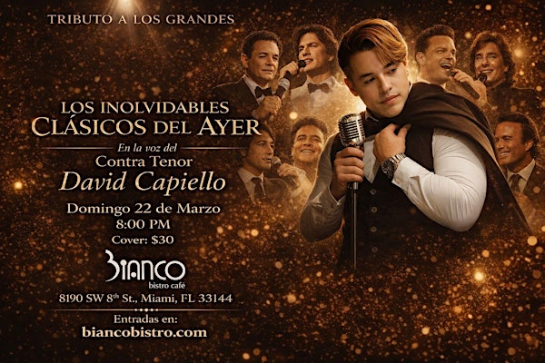 ¡No te pierdas a David Capiello en vivo en el Bianco Bistro Cafe! Ven a disfrutar de una noche llena de buena música y buen rollo el March 22, 2026 at 7:00 PM (Eastern Time). Será una experiencia increíble para relajarte y pasarla genial con amigos. ¡Te esperamos para compartir buena vibra y excelentes canciones!