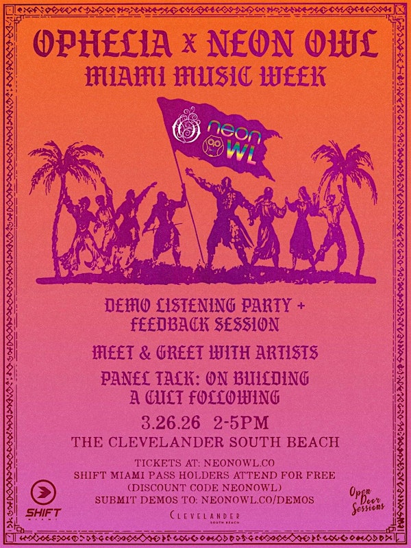 Come hang out with top industry professionals, peers, and more! Meet the Ophelia and Neon Owl team + submit your demo for live play and feedback at Open Door Sessions during Miami Music Week!