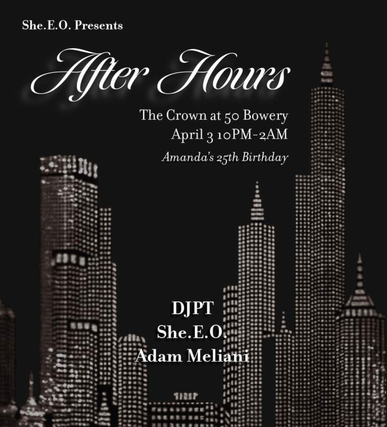 She.E.O. and partners invite you to gaze upon the city from the rooftop of 50 Bowery to celebrate Amanda’s 25th birthday and ponder your Q1 achievements to sounds by: